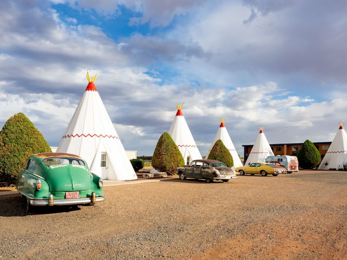 Мотель Вигвам в Холбруке, штат Аризона, позволяет гостям спать в бетонных конструкциях в форме типи. Построенный в 1950 году как часть небольшой сети, это один из двух сохранившихся мотелей Вигвам на Маршруте 66. Планировка осталась в основном неизменной, предлагая уникальный и ностальгический опыт размещения.